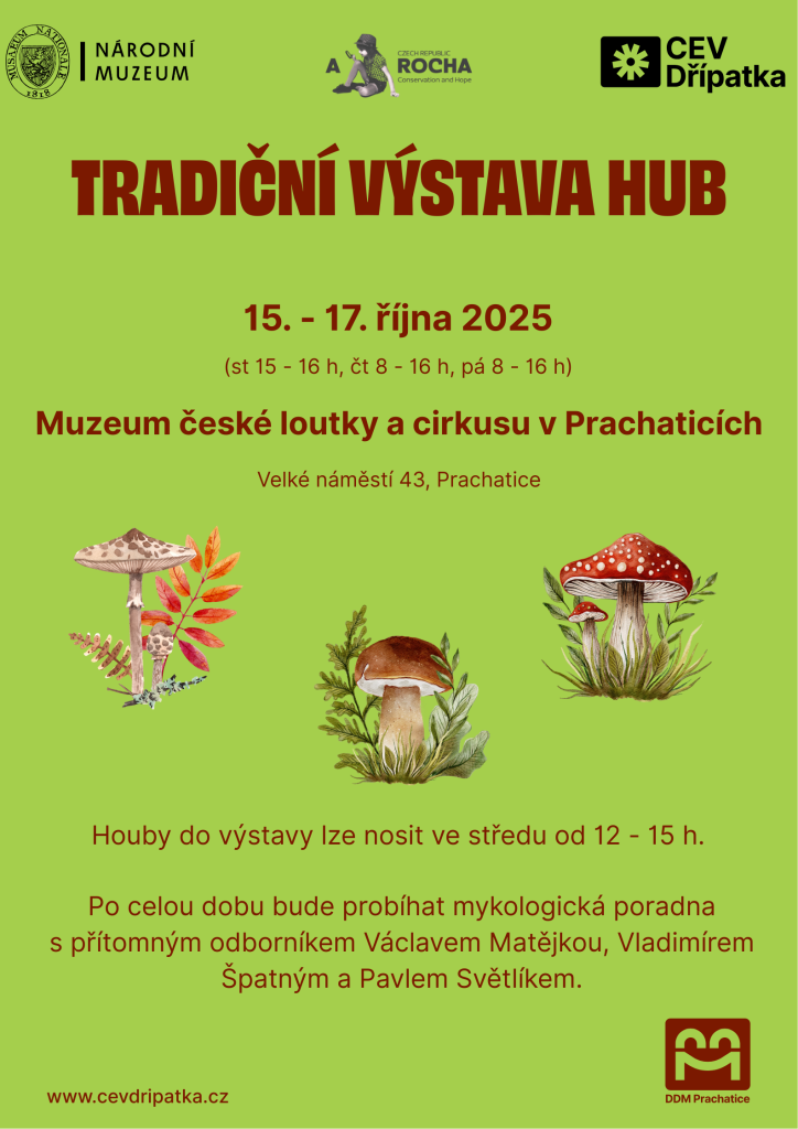 Muzeum české loutky a cirkusu v Prachaticích pořádá tradiční výstavu hub od 15. do 17. října 2025. Akce se koná ve středu a čtvrtek od 8 do 16 hodin, v pátek od 8 do 16 hodin. V rámci výstavy bude mykologická poradna s odborníky Václavem Matějkou, Vladimírem Špatným a Pavlem Světlíkem. Houby do výstavy je možné nosit ve středu od 12 do 15 hodin. Přijďte se podívat na fascinující svět hub a využijte možnost poradit se s odborníky.