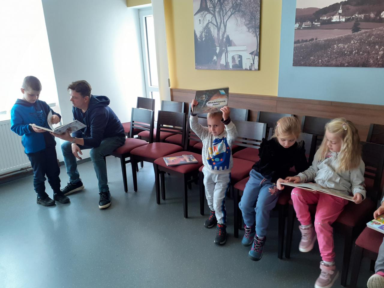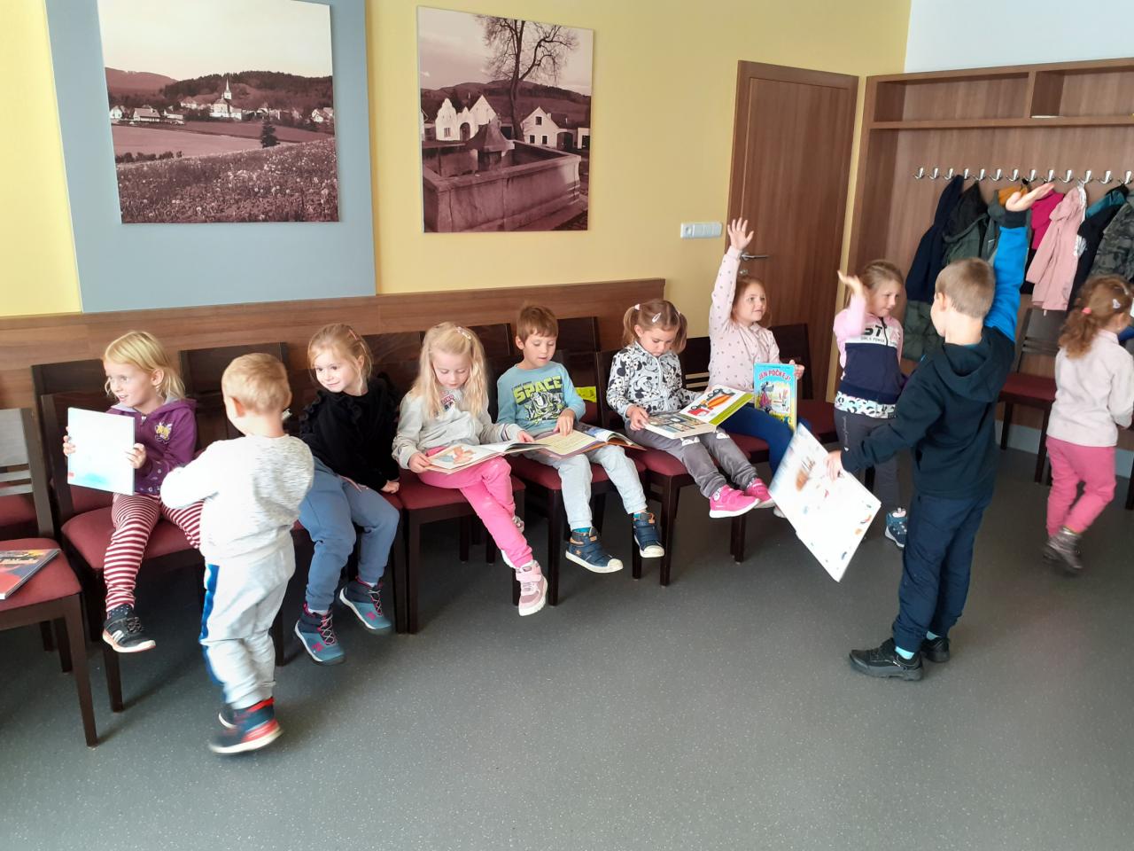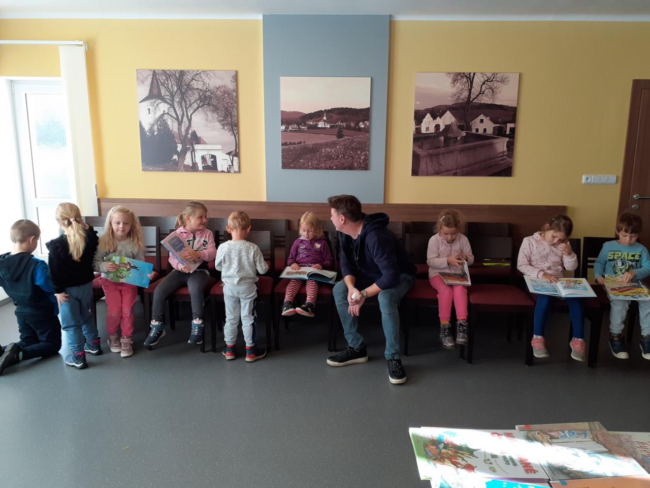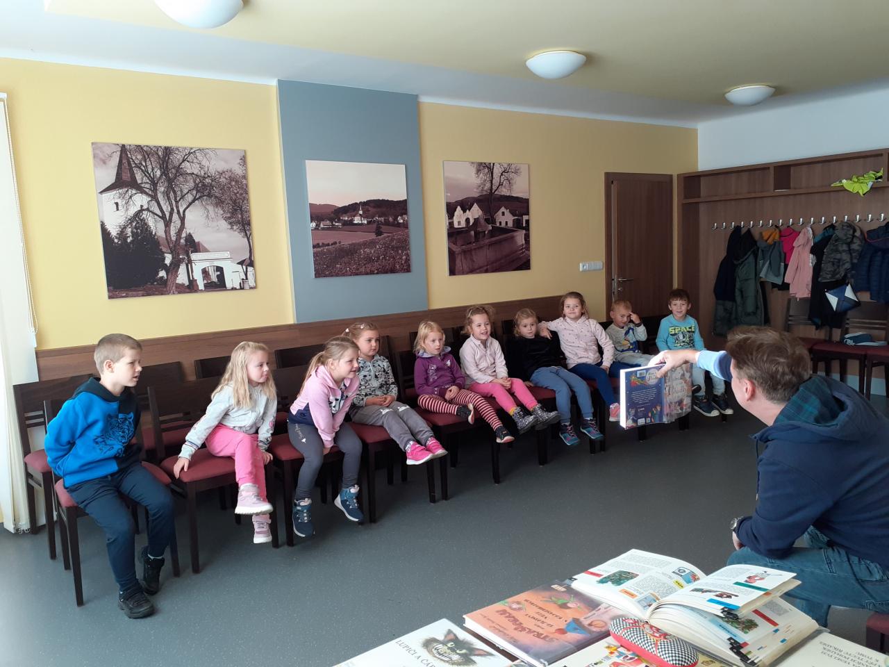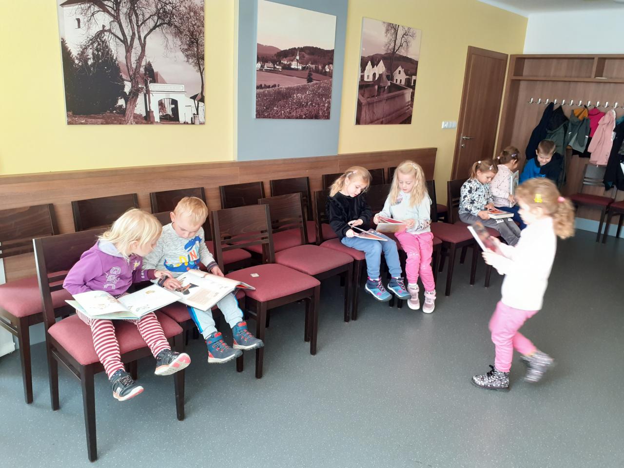 Poprvé v novém školním roce jsme navštívili naši obecní knihovnu v Lažištích. Pan knihovník Rod dětem přečetl několik krátkých zajímavým příběhů a společně si o nich povídali. Děti mají návštěvu knihovny moc rády, baví je prohlížení knih a společné vybírání knih na půjčení do školky.